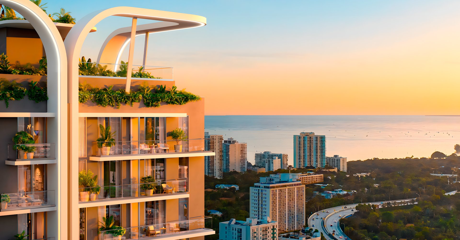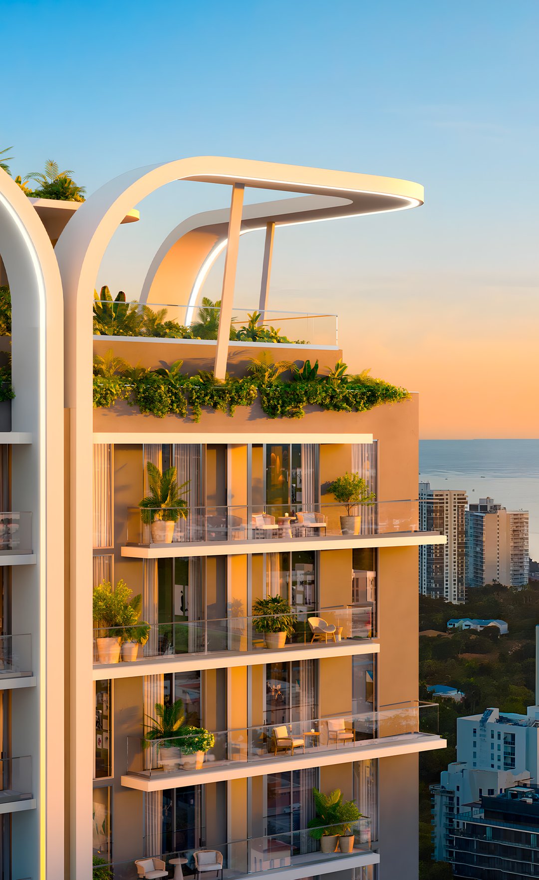 Studio MC+G introduces a sculpted glass façade of layered balconies, a transparent podium engaging the street, and an illuminated crown defining the skyline.