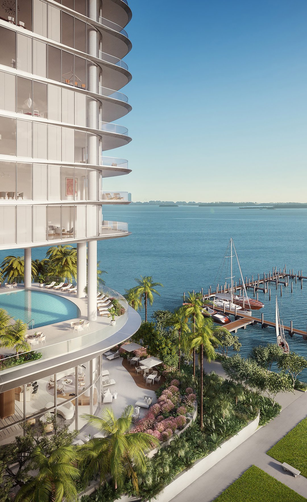 UNA, an elegant tower with a sweeping curve, rises high above Brickell. The building features 135 waterfront units ranging from 1,102 to 7,089 square feet, distributed in spacious 2 to 6-bedroom residences.Architecture