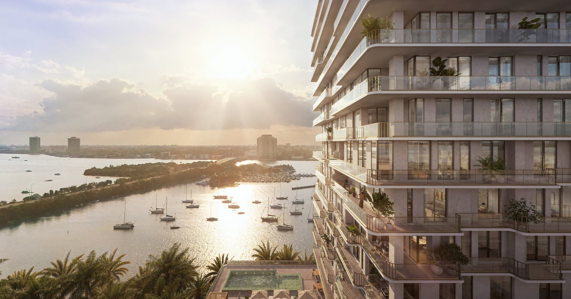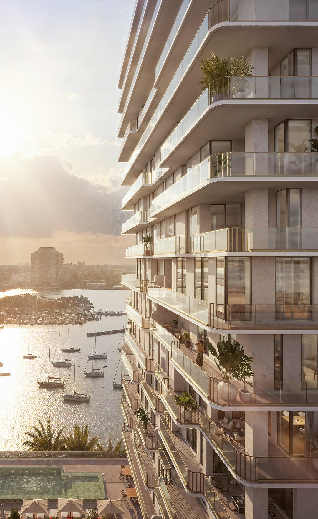 A 21-story boutique tower with only 54 residences, corner-only layouts, wraparound glass terraces, and panoramic exposures that heighten privacy, light, and the waterfront experience.Architecture