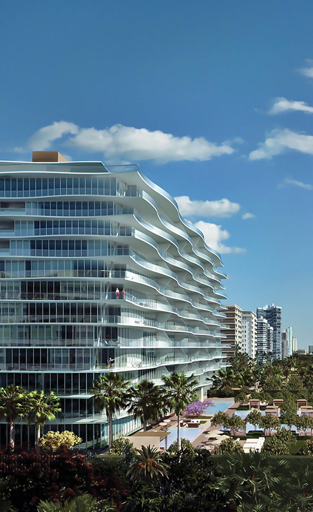 An impeccable living experience with 10 ft. ceiling heights, dedicated elevators leading into private foyers for each residence, summer kitchens, Italian marble, Fendi cabinets, and expansive terraces up to 12 ft. deep that boast stunning ocean and bay views.