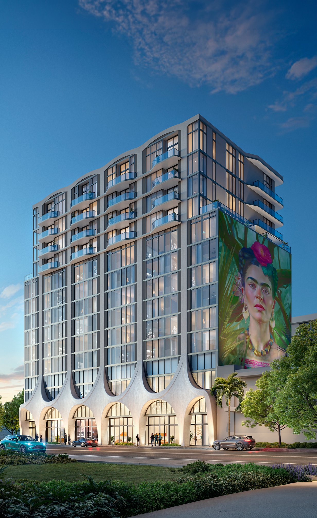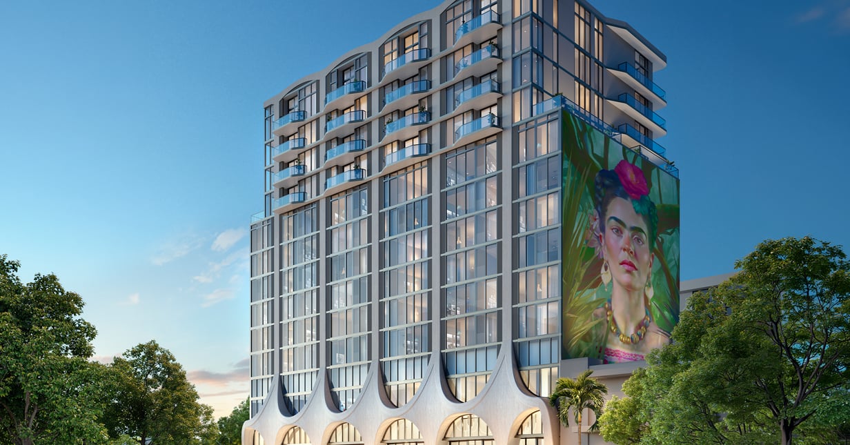 Carlos Ott's conceptual design, executed with CUBE3, translates Frida Kahlo's expressive spirit into graceful curves, sculptural form, expansive glass, and an artistic urban silhouette.